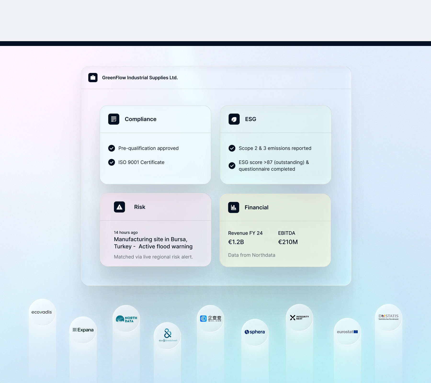 Alle Ihre Daten an einem Ort. Verschaffen Sie sich einen ganzheitlichen Überblick über Kategorien, Lieferanten und Prozesse, indem Sie Ihre internen Aufzeichnungen mit zusätzlichen Daten von Drittanbietern anreichern. Verbinden Sie Finanz-, Risiko- oder ESG-Anbieter wie Northdata, Ecovadis, Eurostat oder Destatis, um einen zentralen Punkt der Wahrheit zu schaffen, mit dem Sie Kategorien und Lieferanten analysieren und umfassende Einblicke gewinnen können.